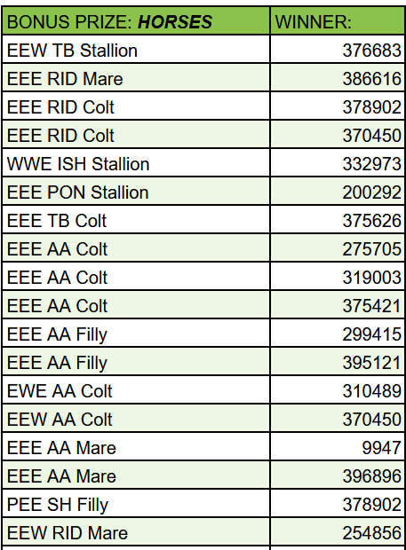 Join us for trivia at 8pm Gametime! Today's themes are: Famous Appaloosas, Famous One-Eyed Horses, Endo the Blind, and name that Appaloosa Pattern. 🎠🎠🎠 Bonus prizes can be sent to FirstLightFarms at 287414 until 7:30. Any sent afterwards will be used for next trivia. Friendly reminder that trivia has moved! From now on, you can join us at https://discord.gg/VZDVCGW2K See you there! *** BONUS PRIZES: Thanks, PK! 30k Thanks, Shroom! EEW TB Stallion EEE RID Mare EEE RID Colt EEE RID Colt Thanks, Willow! WWE ISH Stallion Thanks, Sleep! EEE PON Stallion Thanks, Snowy! EEE TB Colt EEE AA Colt EEE AA Colt EEE AA Filly EEE AA Colt EWE AA Colt EEW AA Colt EEE AA Mare EEE AA Mare EEE AA Filly PEE SH Filly Thanks, Chey! EEW RID Mare EEW RID Mare Thanks, Unstable! EWE KNN Filly EEW KNN Filly EEW KNN Filly Thanks, Angels! WWW TB Straw WWW TB Straw WWW TB Straw WEE TB Mare WWE AA Mare WEE ISH Filly EEE AA Filly Thanks, Sleep! EEP WB Mare PEE WB Mare Edited at March 8, 2026 07:20 PM by FirstLightFarms