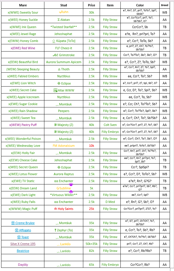197 matches: . Magic Puff did not have week 7 so I have to wait until RO to maybe match her. I may have to yolo her lol 4 potential apricot matches, 3 potential homo champagne matches (plus a few non homo champagne matches), a possible homo rabi match, and a possible homo grey match! Super exciting! Also trying for a WWW color AA colt with my WEW wild mare! . about 4 mil total cost . Edit: Sadly I had to change one of my homo Ch matches ;-; the owner of the stud is a free account and hasn't been on. I am also going to have to do a few LCs because people haven't been responding, and I am going to yolo the WWW maiden lol. (Based on her parent's and sibling's trainings) Forgot to change the genetics for the WWW maiden match. I had her paired with a different stud for a minute. Just ignore that lol Edited at November 30, 2025 08:41 AM by Angels angels