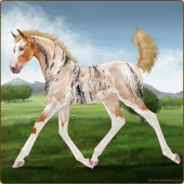 Name: Copper DreamsAge: 1 Filly Color: Dunalino Roan Sabino Frost Appaloosa Breed: Sport Horse Foal Rating: E/E/E |  |