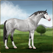 Name: Grano X Stole 196Age: 5 Mare Color: Blue Roan Varnish Blanket Appaloosa Breed: Sport Horse Foal Rating: W/E/E |  |