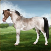 Name: Lever X Pixie 177Age: 20 Gelding Color: Silver Light Bay Roan Dun Tobiano Rabicano Breed: Sport Horse Foal Rating: P/P/P |  |