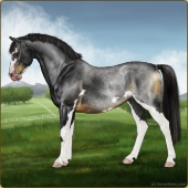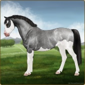 Name: ✨Cassie {EEE}Age: 14 Mare Color: Smokey Blue Roan Tobiano Splash White Sabino Breed: Sport Pony Foal Rating: E/E/E |  |
