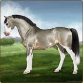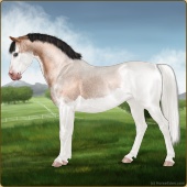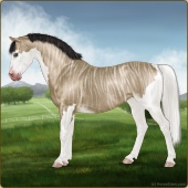Name: ℔ Silvera WWEAge: 2 Stallion Color: Buttermilk Buckskin Roan Splash White Sabino Breed: Sport Pony Foal Rating: W/W/E |  |