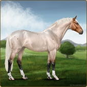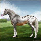 Name: #Astro Cat PEWAge: 8 Mare Color: Silver Golden Bay Dun Splash White Snowflake Appaloosa Breed: Irish Sport Horse Foal Rating: P/E/W |  |