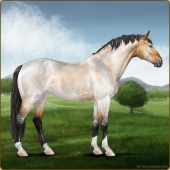Name: Bugsy X PEPAge: 6 Gelding Color: Dunskin Pearl Splash White Breed: Irish Sport Horse Foal Rating: P/E/P |  |