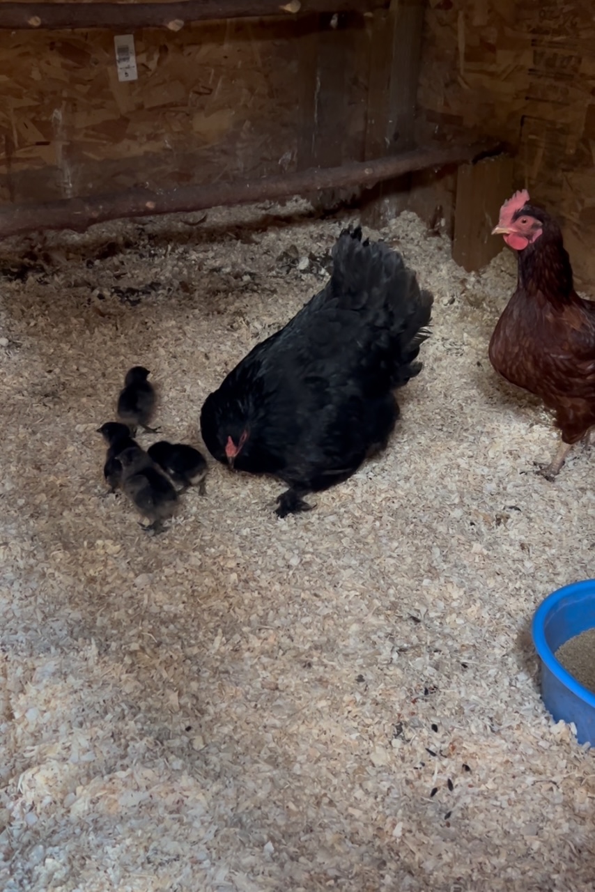 She's home *.* our rooster came in to check her out, took one look at the pissed off, fluffed up and broody hen and promptly went back outside xD