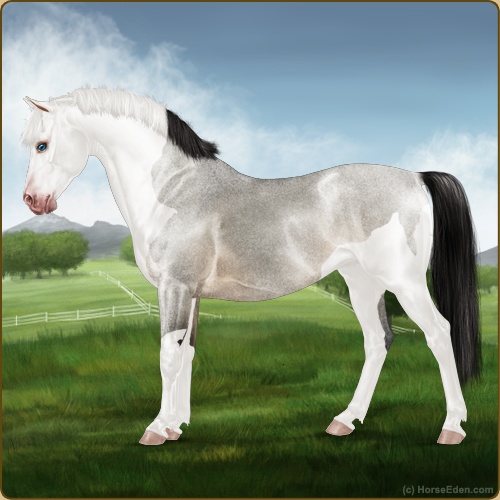 Name: Atlas X plash 193Age: 6 Mare Color: Smokey Grullo Splash White Sabino Blanket Appaloosa Breed: Sport Pony Foal Rating: P/E/P |  |