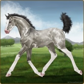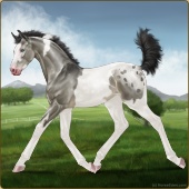 Name: Atlas X Choco 197Age: 2 Mare Color: Grullo Splash White Sabino Varnish Blanket Appaloosa Breed: Sport Pony Foal Rating: P/E/P |  |