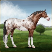 Name: ♠ FreakishAge: 22 Gelding Color: Mahogany Bay Splash White Sabino Rabicano Fewspot Appaloosa Breed: Sport Horse Foal Rating: P/P/P |  |