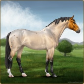 Name: EEE Zz Vixen WhiskeyAge: 20 Mare Color: Silver Buckskin Roan Sabino Breed: Sport Horse Foal Rating: E/E/E |  |
