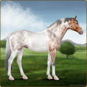 Name: Worlds Pursuer (EEP) 1/5Age: 0 Stallion Color: Silver Roan Tobiano Near Leopard Appaloosa Breed: Sport Horse Foal Rating: E/E/P |  |