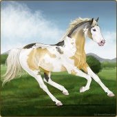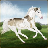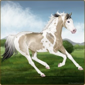 Name: foal 51254083Age: 9 Stallion Color: Gold Creme Dun Tobiano Splash White Sabino Rabicano Frame Breed: Thoroughbred |  |