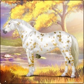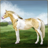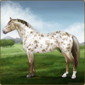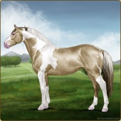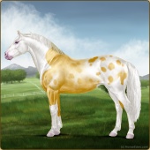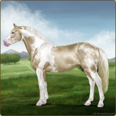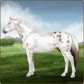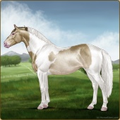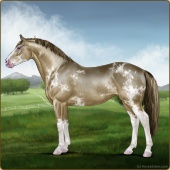 Name: prlZCh*ToSplLp EEPAge: 15 Mare Color: Silver Classic Champagne Tobiano Splash White Leopard Appaloosa Breed: Irish Sport Horse Foal Rating: E/E/P Bravery Rating: Sub-Par |  |