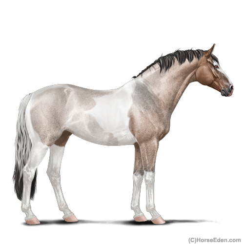 Color: Mahogany Bay Roan Dun Tobiano Rabicano