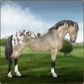 Name: Soter X Wall EEEAge: 10 Mare Color: Buckskin Roan Blanket Appaloosa Breed: Knabstrupper Foal Rating: E/E/E |  |