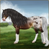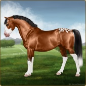 Name: ⍦ MagazineAge: 14 Gelding Color: Mahogany Bay Splash White Sabino Blanket Appaloosa Breed: Sport Pony Foal Rating: P/E/E |  |