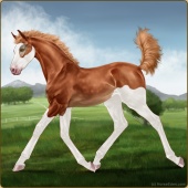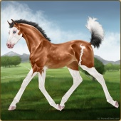 Name: SSE Trickster GoddessAge: 3 Mare Color: Liver Chestnut Splash White Sabino Blanket Appaloosa Breed: Sport Horse Foal Rating: E/E/W Bravery Rating: Sub-Par |  |