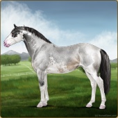Name: SLF Akhilleus Kosmos EWWAge: 9 Stallion Color: Silver Roan Grullo Sabino Rabicano Blanket Appaloosa Breed: Irish Sport Horse Foal Rating: E/W/W |  |
