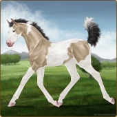 Name: Aldeb X Glorf 200Age: 1 Filly Color: Buckskin Tobiano Splash White Rabicano Breed: Irish Sport Horse Foal Rating: E/E/E |  |