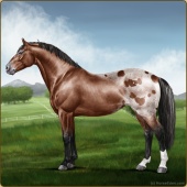 Name: (PEE) Birthday Albie CruzAge: 6 Stallion Color: Mahogany Bay Roan Blanket Appaloosa Breed: Irish Sport Horse Foal Rating: P/E/E |  |