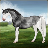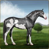 Name: Snork X Samso 196Age: 5 Mare Color: Smokey Black Tobiano Splash White Frost Appaloosa Breed: Sport Pony Foal Rating: P/E/P |  |