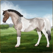 Name: 42934176Age: 3 Mare Color: Dunskin Roan Tobiano Breed: Sport Pony Foal Rating: W/S/S |  |