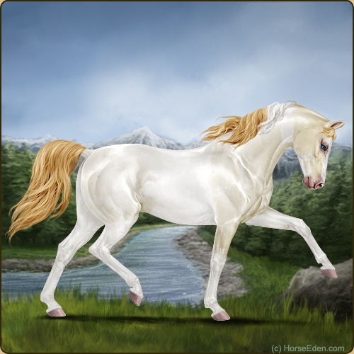 The color of his coat is a light chestnut, and his thick, full mane and tail is creamy colored.