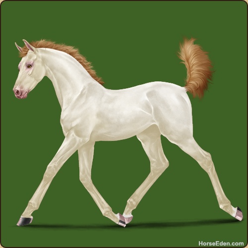The color of his coat is a light chestnut, and his thick, full mane and tail is creamy colored.