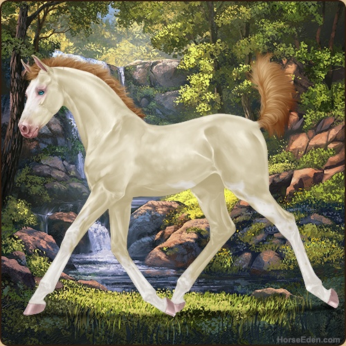 The color of his coat is a light chestnut, and his thick, full mane and tail is creamy colored.