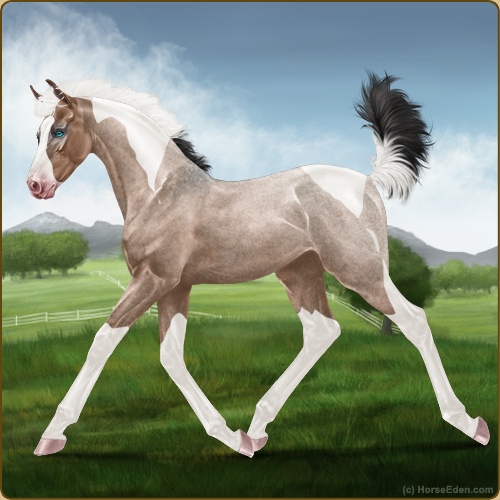 Color: Mahogany Bay Roan Dun Tobiano Splash White Sabino