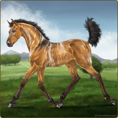 Color: Golden Bay Dun Varnish Appaloosa Brindle