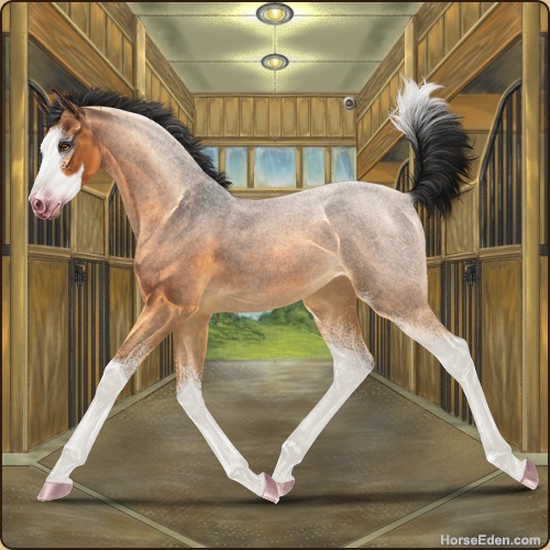 Color: Copper Bay Roan Dun Splash White Sabino