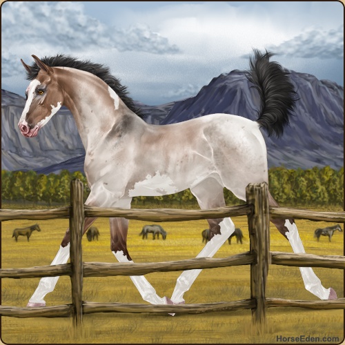 Color: Mahogany Bay Roan Dun Tobiano Sabino