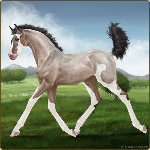 Color: Mahogany Bay Roan Dun Splash White Sabino