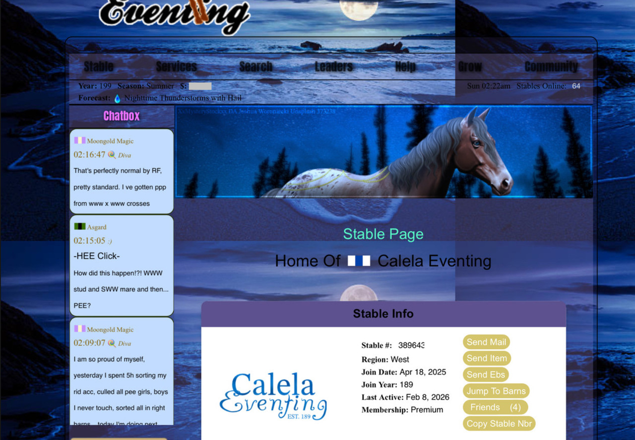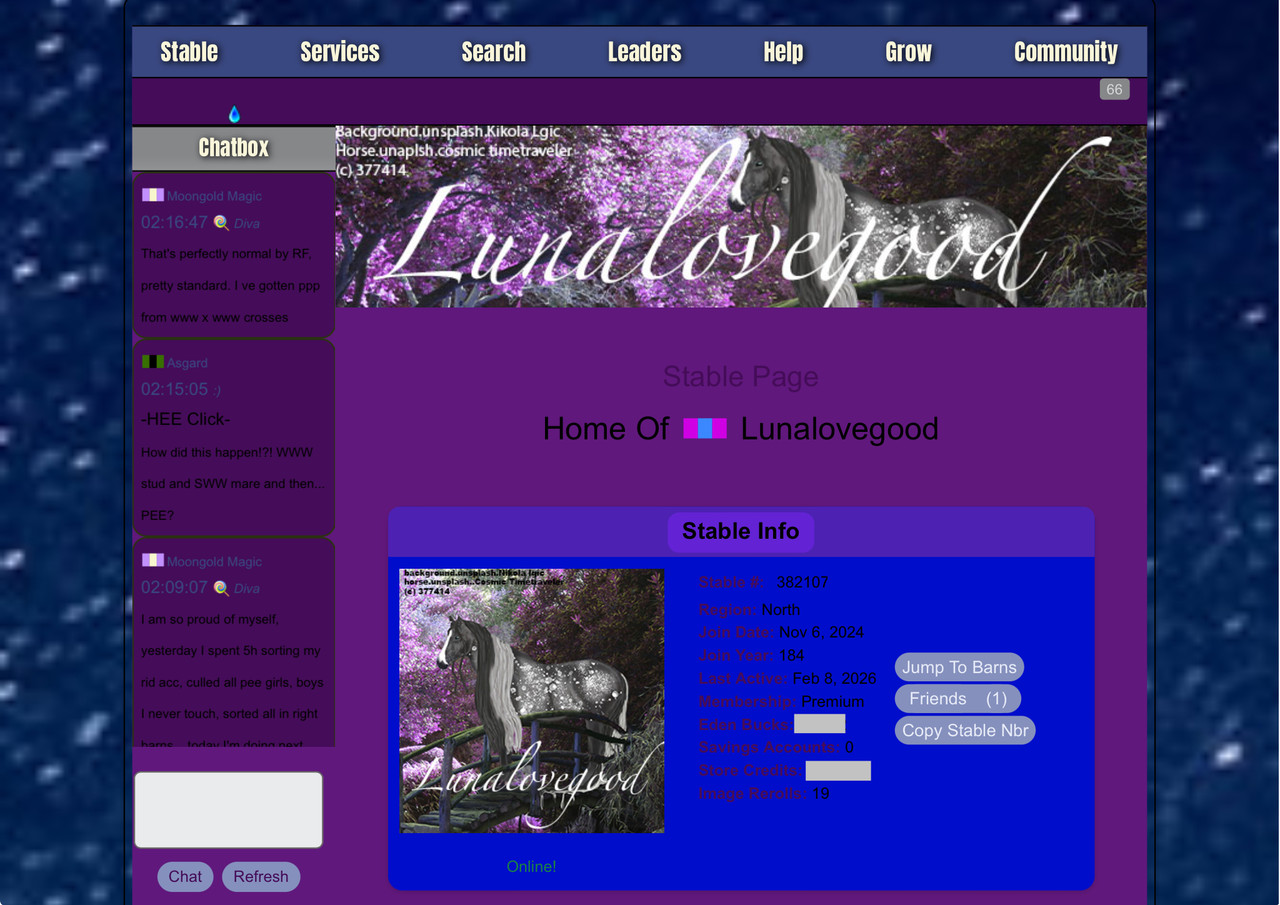 Stable number: 395482 Stable name: SillyBilly Farm Free rein Main colors: DEEP blue Text color: anything that is visible lol Ebs: 7k. Paid: NO