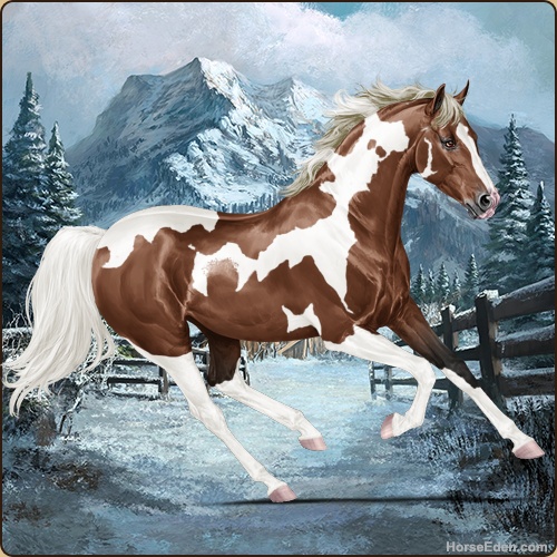 Name: Highglen Jorik EWEAge: 3 Stallion Color: Silver Mahogany Bay Roan Tobiano Sabino Breed: Thoroughbred Foal Rating: E/W/E |  |